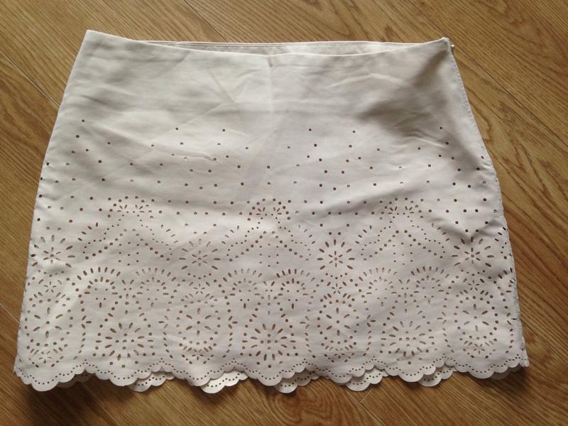 Дефектов нет, цвет бежевый (молочный), длина 30/32, в поясе 35, низ 46. Материал мягкий (скорее всего, синтетика), есть подкладка.