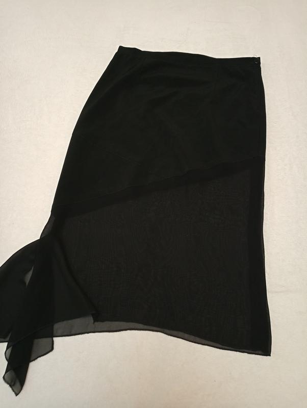 Чорна спідниця зшита на замовлення. На правому боці кутом. Нижня частина прозора. Довжина по лівому боці 70см Довжина до прозорої частини по лівому боці 30см Довжина по правому боці до прозорої частини 50см Піт 37см Побіди 48,5 см