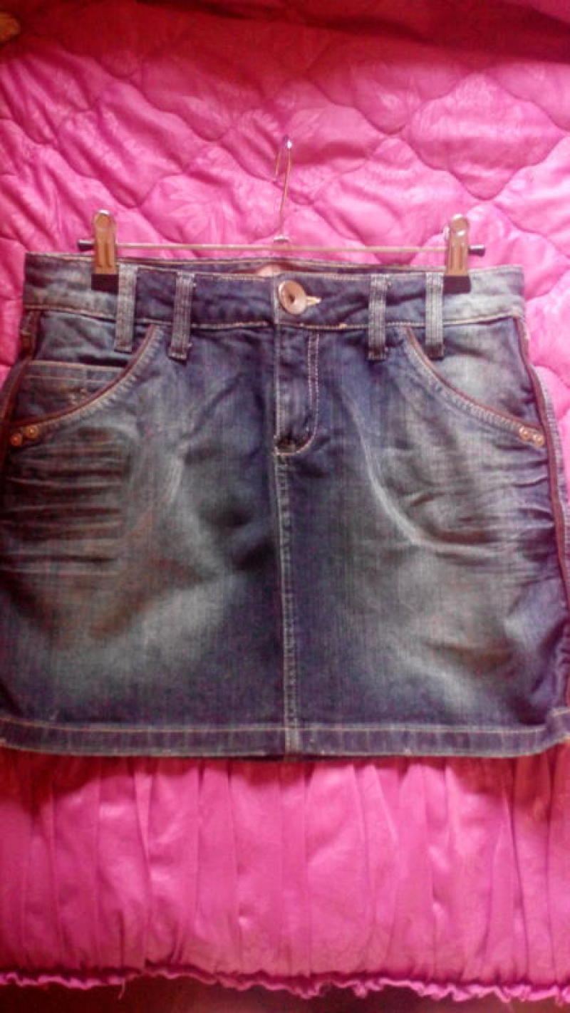 Джинсовая мини юбка с кожаными кантиками по бокам и сзади.