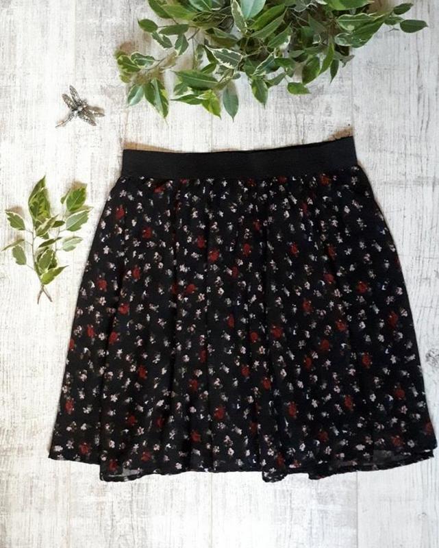 Красива чорна спідниця в квіточку, пояс на резинці, тягнеться. Розмір S. Довжина спідниці 43 см, ПОТ 33 см, + тягнеться, бера вільні. Додаткові фотографії висилаю.