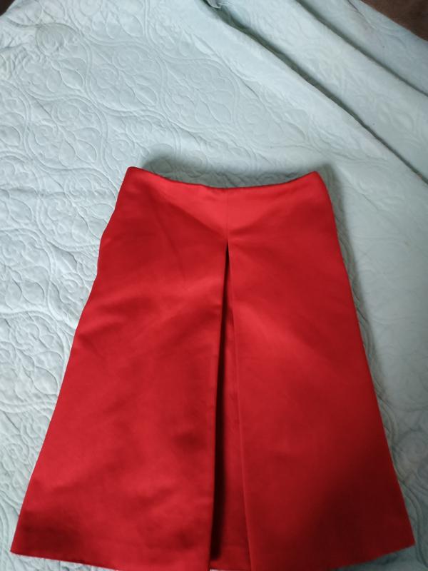 Юбка из плотного материала с карманами и встречной складкой. Цвет приглушённый красный. Стильная дорогая вещь. Длина 51 см, полуобхват талии 40 см, в бедрах свободно за счёт кроя