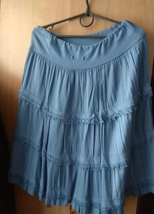 Юбка джинсового цвета из тонкого котона. Верх на трикотажной кокетке.Подклад тоже Котон.Дл.58см.талия36 в нерастянутом виде.Бедра свободно.Очень комфортная и мягенькая.На лето самое то.