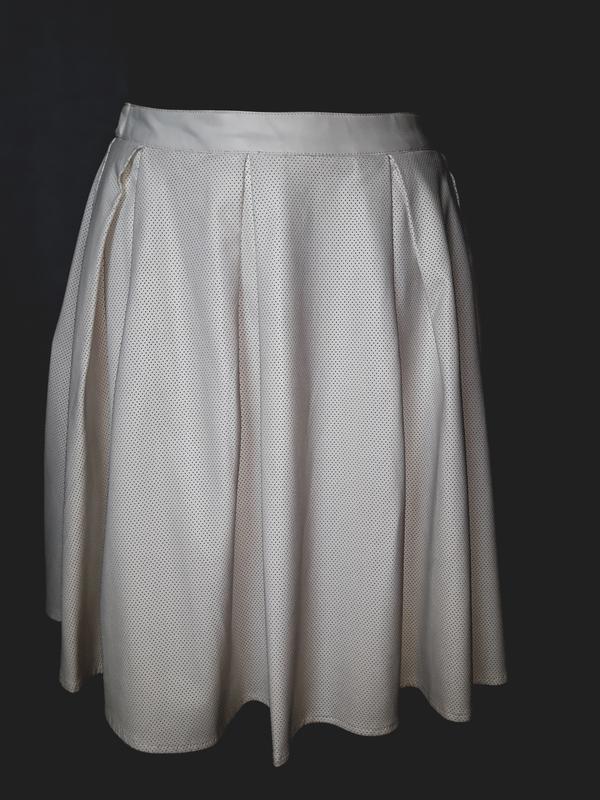 Очень славная юбка из перфорированной эко кожи на подкладке.Юбка фалдит за счет небольших складок.Цвет молочно белый.Пот 37-38см.Длина 50см.Славно сядет на стройную девичью фигурку. Размер S-M.Сверяйтесь с замером талии.