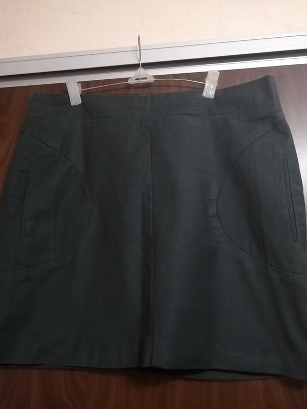 Спідниця чудесного благородного темно-зеленого кольору. ПО боках кишеньки, застібається на змійку ззаду. Має підклад хорошої якості. Дефектів і нюансів немає.