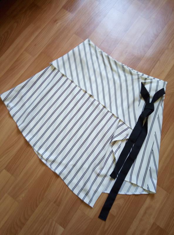 Прекрасная ассиметрическая юбка в запах, с заниженой линией талии. Продольная полоска очень стройнитт фигуру. Бирки срезаны. Пот 42 Поб 50 Длинна 53
