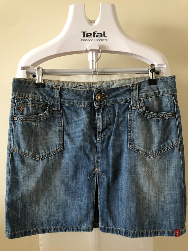 Стильная джинсовая мини-юбка трапецией со шлицей спереди, размер L{40}