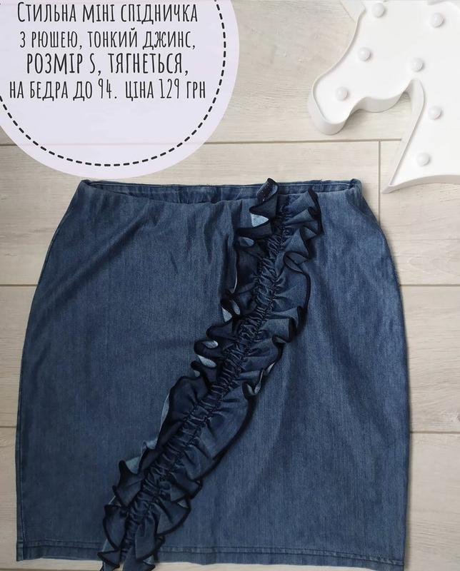 Стильна міні спідничка з рюшею, тонкий джинс, розмір s, тягнеться, на бедра до 94. на поясі широка резинка