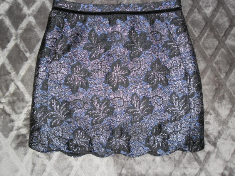 Юбка женская мини нарядная новая,разме евро 8(34) 42размер от OASIS. Фирменная,71% полиэстер,29% люрексовая нить. Ткань парча нетяжёлая,отличного качества. Внутри юбка на чёрной подкладке-100% полиэстер. Очень красивая расцветка в сине-черный тонах. Юбка прямого покроя,чуть расширена к низу. Красивое оформление низа. Сзади застёжка на молнию. Есть выточки,рельефные швы,очень хороший пошив. Очень касивая нарядная юбка с бирками. Замеры по изделию: Пот-35,5см. Поб-45-46см.Ткань не тянется. Ширина по низу юбки-49см. Длина юбки по боковому шву-42,5см. Без торга.