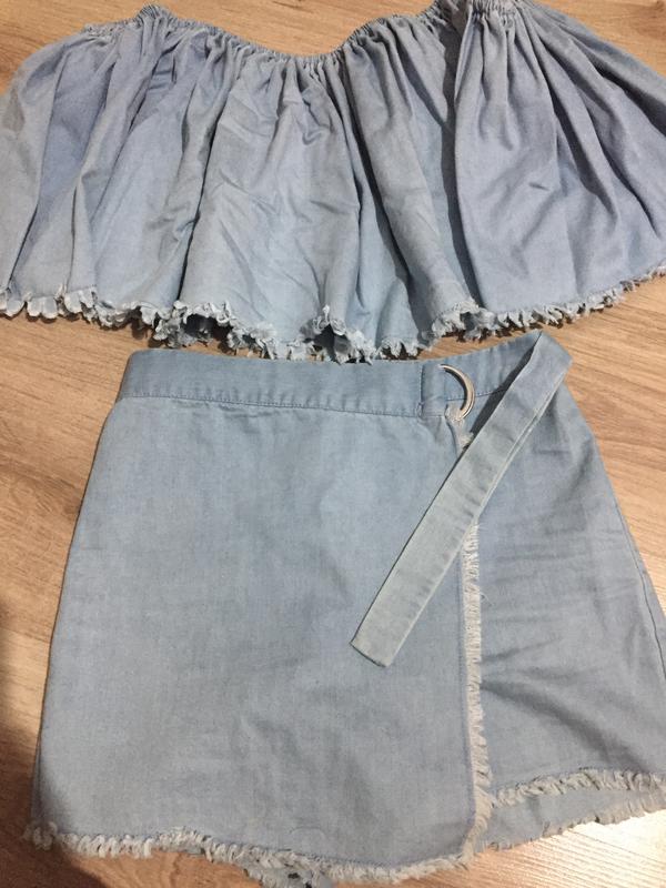 Летний кстюмчик из легкой ткани под джинс голубого цвета, низ - юбка-шорты, верх - топ с открытыми плечами