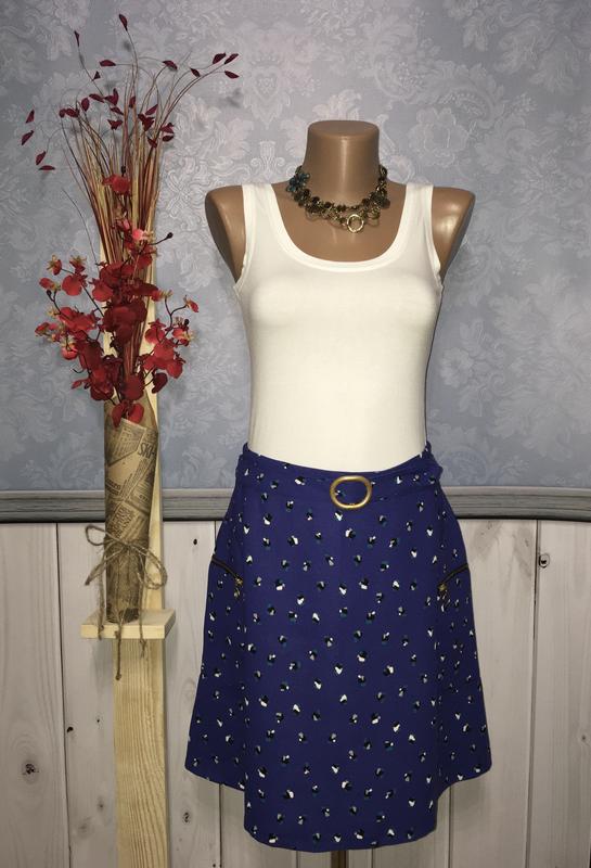 Юбка-трапеция по бокам с накладными карманами на молнии и декоративным поясом. Фурнитура бронзового цвета. Ткань плотная, но эластичная. Замеры: Длина 49 см Ширина по поясу 40 см Ширина по низу 64 см