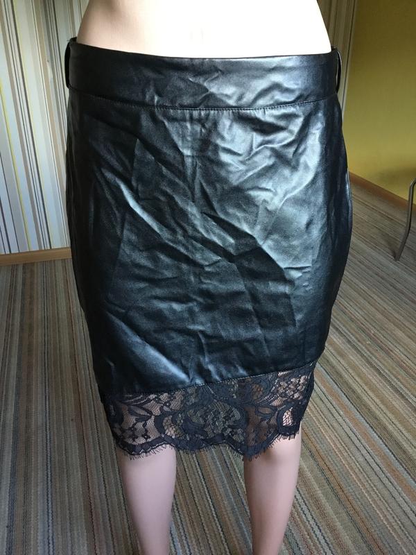 Чёрная юбка кожанка( заменитель!). Размер L. Красиво смотришься. Внизу декор кружево. Есть петельки на поясе. Замеры: пот 38, ПоБ 46, длина 47, сзади молния 20 см.