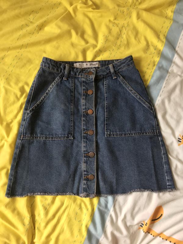 Джинсовая юбка из плотного денима на бронзовых пуговицах, немного тянется. Замеры: Длина сзади - 45 см Длина спереди - 41 см ПоБ - 45 см ПоТ - 33 см