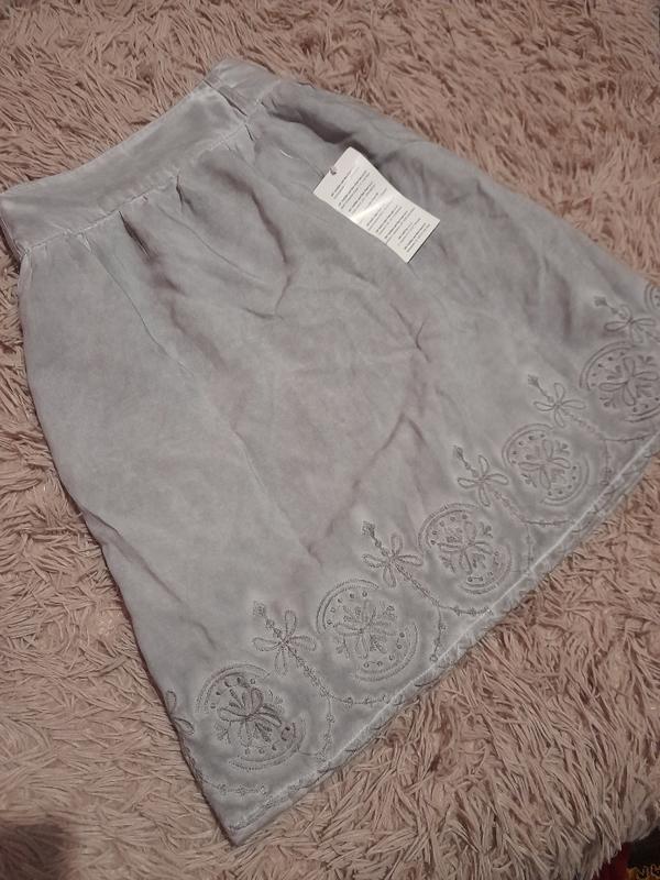 юбка серого цвета с подкладкой. Приятная ткань и актуальная модель. Размер на брке указан 36, но смотрите замеры, потому что большемерит Длина 50 Пояс 41 Низ ширина 66