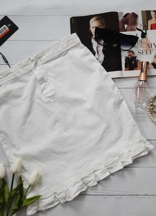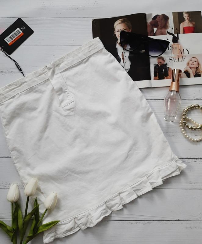 Белая юбочка с оборочкой снизу. Материал плотный, типа джинса. Размер 8. Полуобхват талии - 35 см. Полуобхват бедер - 43 см. Длина - 43 см.