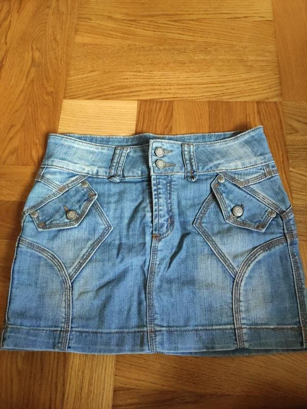 Дуже класна джинсова спідниця. Гарно підкреслює попу, цікаво виглядає на переді. Низької посадки, на дюймовочку. ПОТ 38, ПОБ 43, довжина 34. Без дефектів.