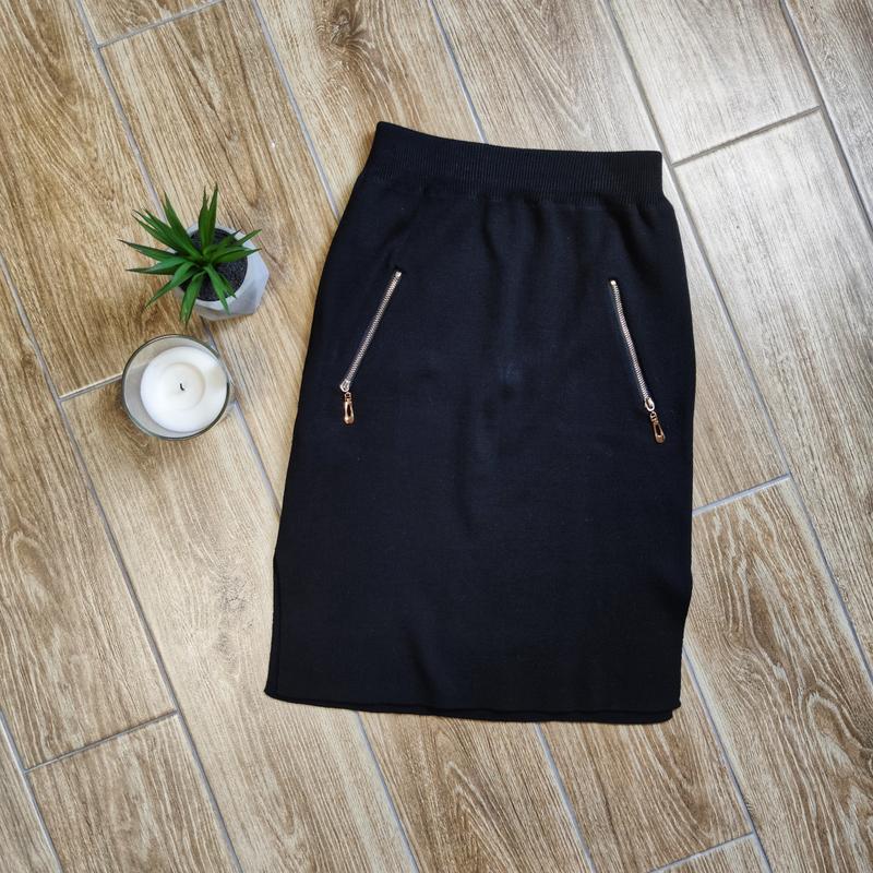 🖤 Черная трикотажная юбка с золотой фурнитурой. По бокам небольшие разрезы. Карманов нет, это декор. Если носить на талии, то мини, а если на бедрах, то по колено. Состояние новой, очень хорошо тянется. 📏 Замеры: длина 53, талия 27, бедра 37,5.