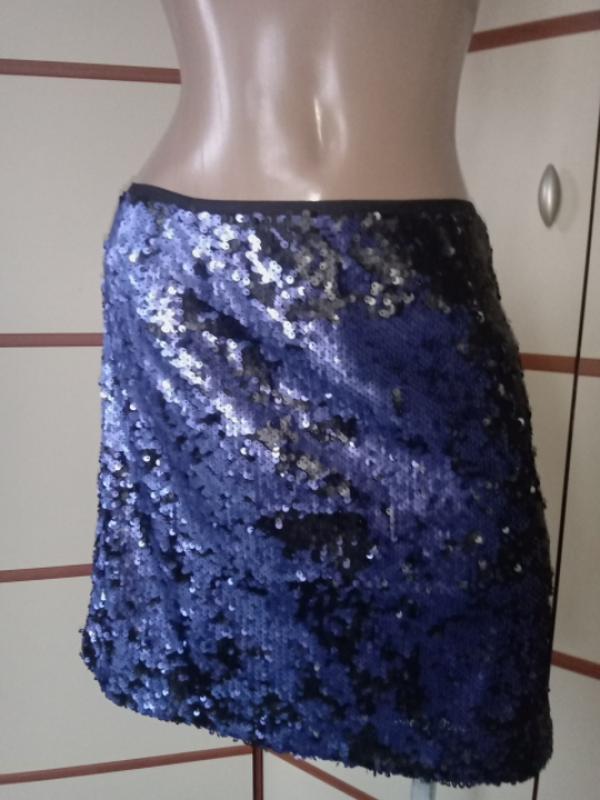 Красива двоколірна спідничка в паєтки,(в одну сторону сірєнєва,в другу чорна),розмір М-L (вказаний 12)довжина 42см,пот 39см,поб 50см.