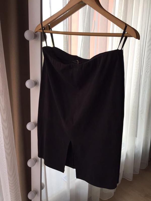 Есть доп.фото. Сложно фотографировать черные вещи, поэтому юбка представлена при двух освещениях, но приближенная к 1-5, 10 фото, юбка черного цвета Ткань тонкая, пояс на резинке 92% полиэстер 8% эластан пот 37см поб 46,5см низ 44,5см (снизу спереди разрез) длина 57см