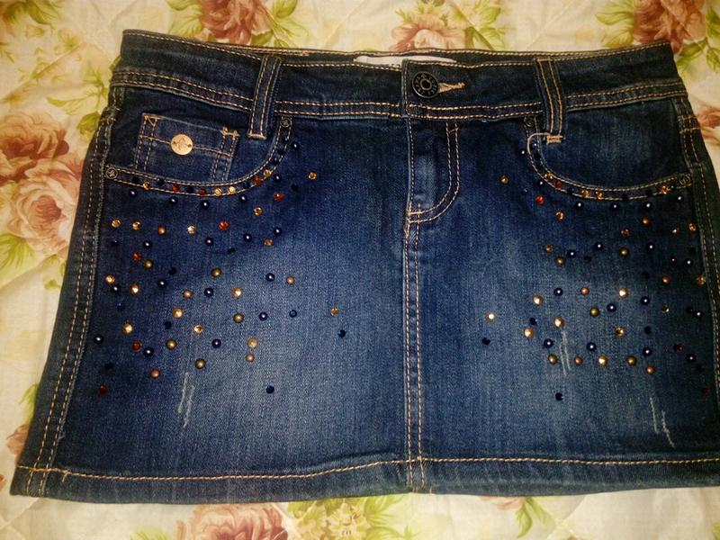 Міні-спідниця джинсова у ідеальному стані без дефектів та плям, оздоблена бісером. Пояс півобхват 38см. Довжина 29см. ПОБ 40см.