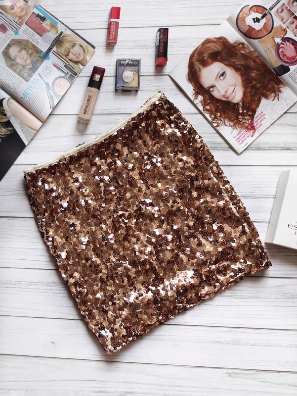 Представляю Вашему вниманию удивительную юбку, в пайетках, золотисто-розового оттенка,бренд Only. Юбка сама на мягусенькой подкладке, что не позволит поцарапаться об пайетки. Материал : полиестер, эластан. Замеры: длина-40 поб-44 пот-35 тянется хорошо