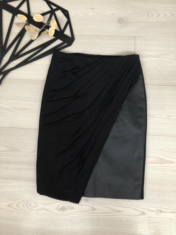 Шикарная комбинированная, ассиметричная юбка, очень актуальная, с одной стороны эко-кожа с другой ткань в складочки, складочки тренд,будет не один сезон как и кожа. Ткань плотная. Идеальное состояние. Высокая посадка. Сзади разрез. Замеры П.о.т-33 П.о.б-42 Длина-52 Разрез-14 см