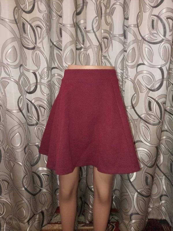 Юбка из плотной ткани Шведской компании H&M Размер 46. Фасон расклешонный. Состояние: новое. СТОК. Цвет бордо. Замеры п.о.талии 37см. П.о.бедер 70см. Длинна изделия 45см. Сзади застёгивается на молнию.