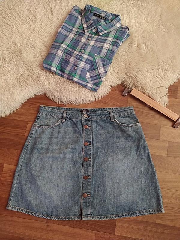 Джинсова спідниця попереду на гудзиках розширена до низу. Нова.