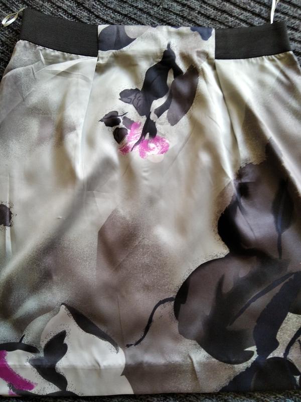 серая+цветы, пояс- частично резинка, сзади молния, дл. 52см, полиэстер, лёгкая