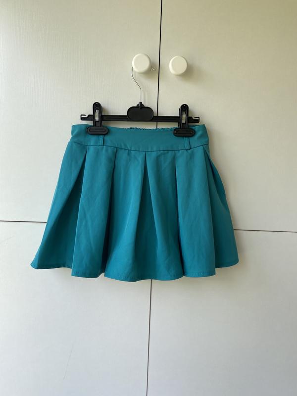 Шорты-юбка,бирюзового цвета, креп, параметры: талия - 60 см, бедра - 92, длина от середины пояса до внутреннего шва - 24 см.