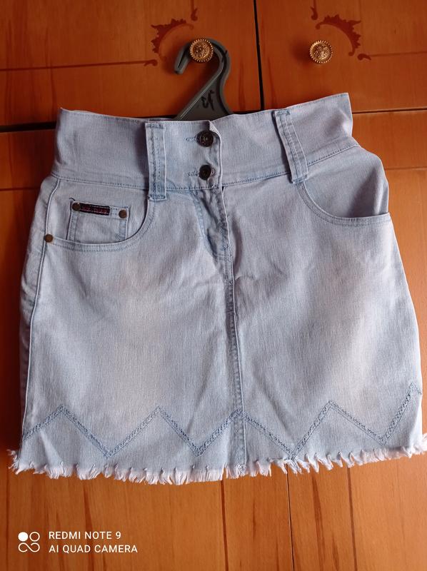 Світло-голуба з протертостями матеріал тягнеться Пояс полуобхват 40 см Бедра полуобхват 50 см Довжина 43-45 см
