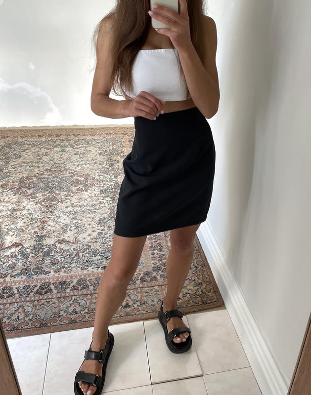 Міні-юбка чорного кольору, у розмірі S-M, тканина костюмна, є підклад, ззаду застібка. Як нова! Склад:поліестер. Заміри: ПОТ талія - 35см ПОБ бедра - 48см довжина - 47см