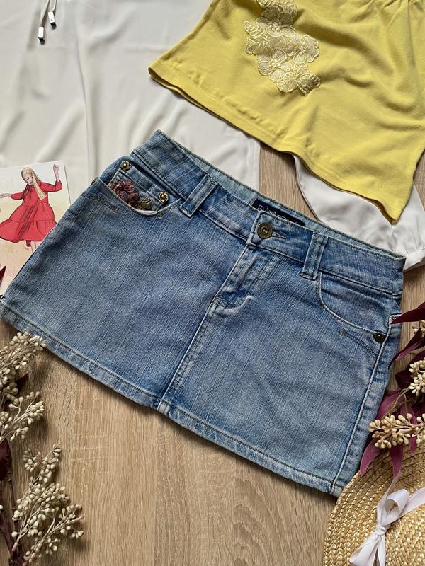 Джинсова міні спідниця, світлого деніму З кишенями ззаду та спереду Джинс середньоі плотності, трішки тягнеться, але не сильно В поясі зроблені вшитки, при потребі їх можна розпустити Декорована стильною нашивкою Посадка середня Заміри: Пот 34 (або 38см) Поб 46,5 Довжина 30