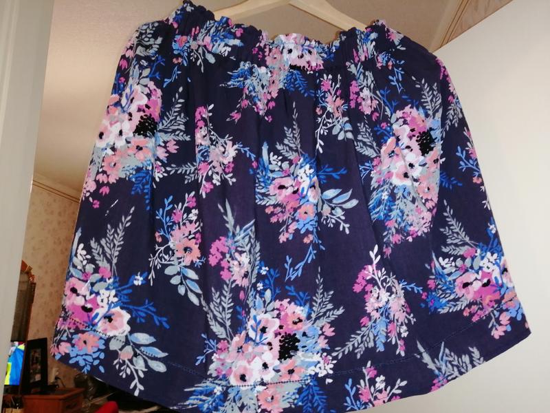 Юбка синего цвета в цветочный принт. Пояс на резинке. С карманами по бокам. Пот 36 тягнеться до 50.Длина 46.Низ 80см..Пояс 4см.Длина 45