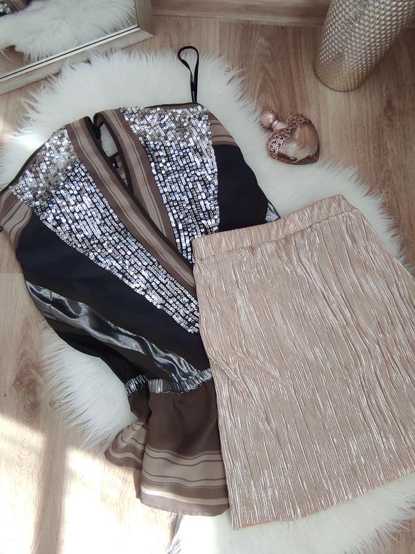 Очень красивая коктельная юбка серебро с бежевым от Miss Selfridge . Размер eur 38, uk 10. Учитывайте замеры: длина 44 пояс 34 бедра 40