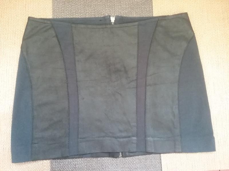 Очень стильная миниюбка сделана из кожи и трикотажа. Кожа очень мягкая и эластичная, отлично ложится по фигуре. Сзади полность застегивается молнией. Такой второй юбки Вы не найдете. Цена очень демократичная, одевалась юбка пару раз. На бирке размер 10.