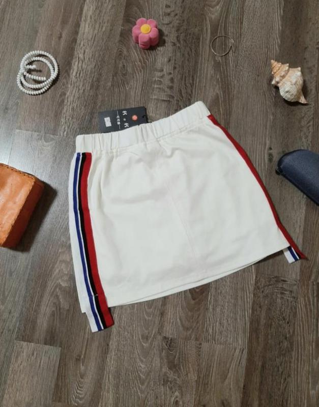 🎀Стильна спідниця 🎀 Класна біла спідниця та підклад шортиками. По боках яскраві лампаси. Розмір М Виміри: ПІТ(гумки в нерозтягнутому стані)-32 ПОБІДИ-47 Довжина виробу-38 Колір: Білий