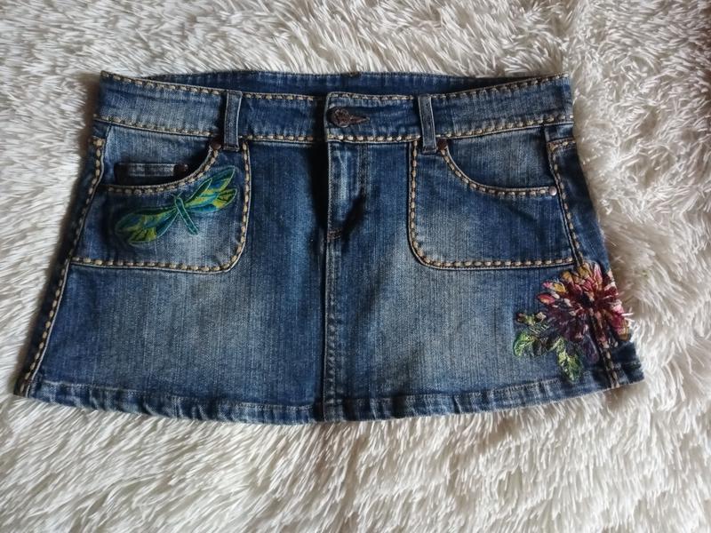 Класна джинсова спідниця з красивою акуратною вишивкою, розмір М.