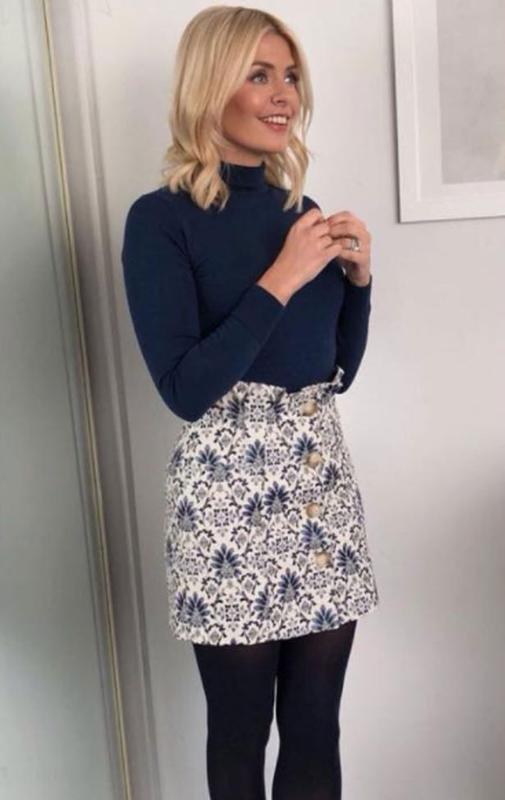 Cтильная мини-юбка с принтом, на пуговицах, сделанную из жаккарда.