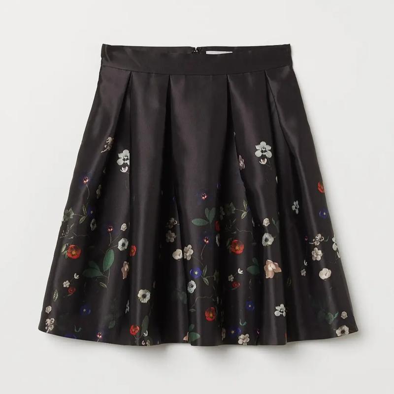 Юбка от H&M в форме колокольчика из узорчатого атласа с завышенной талией, складками вверху, потайной молнией и застёжкой на пуговицу сзади , а также карманами в боковых швах. Без подкладки. Состав100% полиэстер(но очень плотны и дорого выглядит) Цвет черный(на фото вышел с отливом) Новая с биркой Размер указан 36 ПОТ-32 СМ. Длина-49 см. 💰- 220 грн.