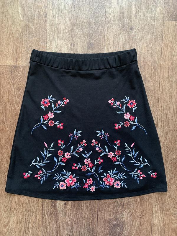 Юбка с вышивкой размер М, длина 51 см, полуобхват талии по резинке в спокойном состоянии 35 см, тянется до 51 см, ПОБ 52 см, 68% вискоза, 27% полиэстер, 5% эластан
