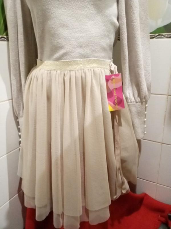 Має сліди примірки, зрізана з середини етикетка. Має етикетку бумажну, і якісь дві шлєйки пришиті. Має брак, останнє фото. Таке в 4 - х містах по нижньому шару сітки. Має з під низу обтягуючу юбку. Напів об'єм талії 31+8 см. Довжина юбки в цілому 50 см. Напів об'єм бедер нижньої юбки 38.