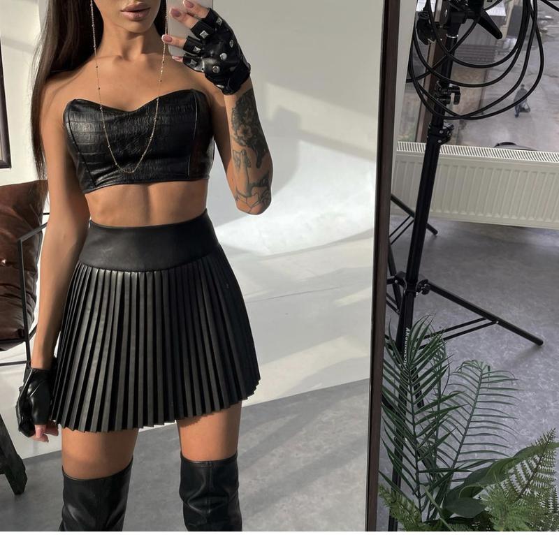 Мини юбка из эко-кожи, плиссе. Сзади на молнии. Идеально подчеркивает и выделяет талию. Длина 40 см