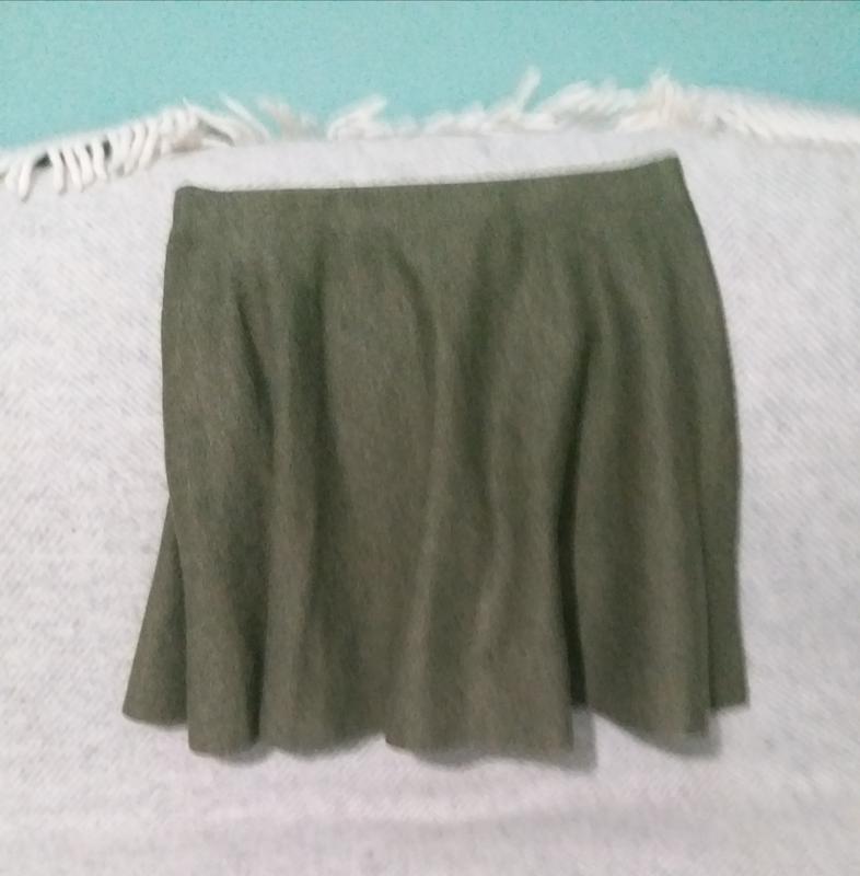 Теплая мини юбка из плотного трикотажа расклешоная полусолнце, без подкладки, пояс 3,5см внутри резинка. Цвет хаки с вкрапленияем нитей трех оттенков.Замеры:полуокружность талии 38см, длина юбки от пояса 41см, ширина пояса 3см. Состояние:идеальное без дефектов.