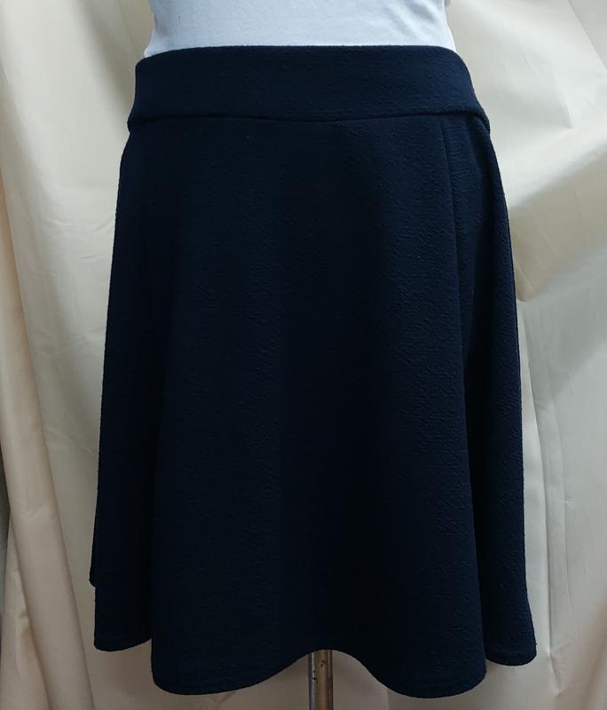 Тёмно-синяя юбка, фактурная,Германия, очень красиво сидит на фигуре. Пояс на широкой резинке. Размер указан L, подойдёт на L-XXL. Мерки: пояс 48 см, длина 53 см . Состав: 98% полиэстр, 2% эластан.