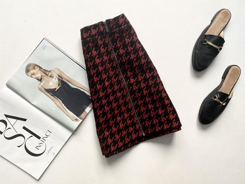 Спідниця в гусячу лапку бордо хс 6 Довжина 44. Піт 34 спереду замок. Побіди 42. Низ 45. Без підкладки