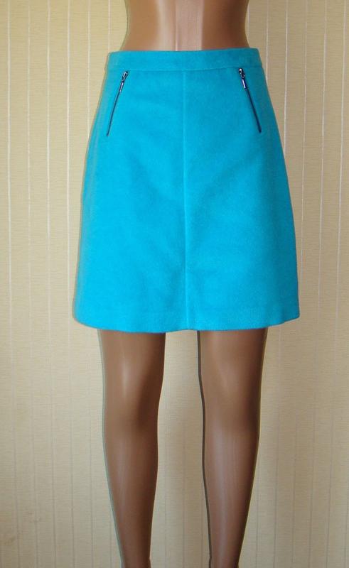 Длина мини. На подкладке. Ткань: 85% полиэстер, 15% шерсть. Размер 42 (XS, EUR 36, UK8). Ширина по талии 35 см. Ширина по бёдрам 46 см. Длина по боковому шву с поясом 48 см.