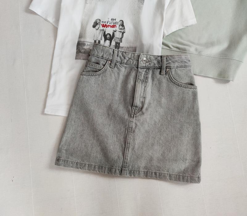 🌿сіра джинсова спідниця від Mango крою трапеці Розмір:М Заміри: ширина поясу 40 см, ПО бедер 50 см, довжина 43 см Склад:котон