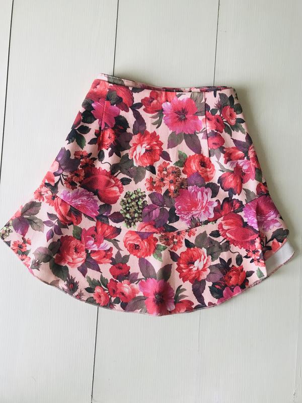 Яскрава міні з фактурного матеріалу Фасон трапеція Декорована рюшкою Збоку потайний замочок Довжина збоку 27 см , посередині 41 см Пояс півобхват 43 см Бедра 50 см
