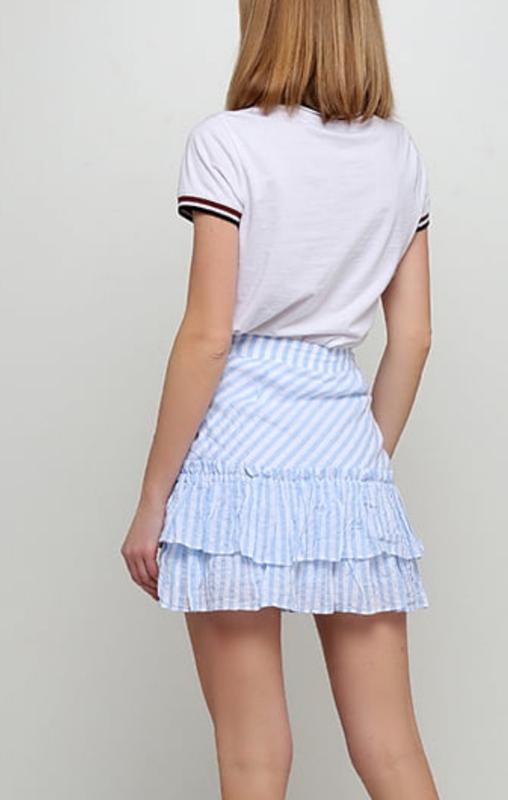 🌿голуба спідниця з рюшами від H&M збоку на замку, тканина тонкий котон з підкладкою Розмір:38 Заміри: ширина поясу 36 см, стегон 55 см, довжина 45 см Склад:котон