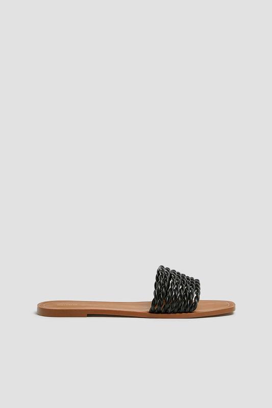 Черные открытые шлепанцы с плетеными ремешками спереди. Высота подошвы: 0,5 см.
